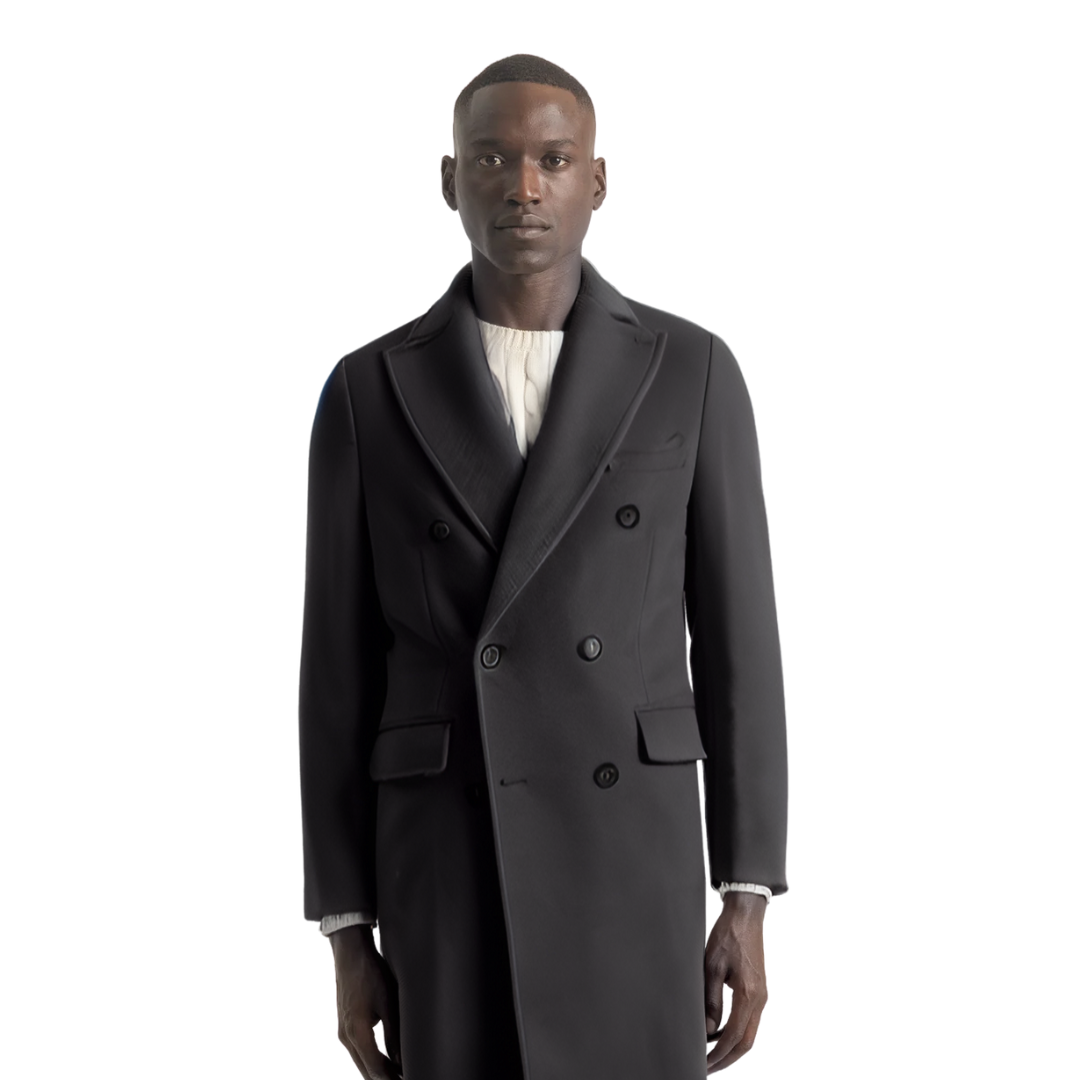 Diseño sobrio: solapa amplia, botones frontales y posiblemente bolsillos laterales discretos.