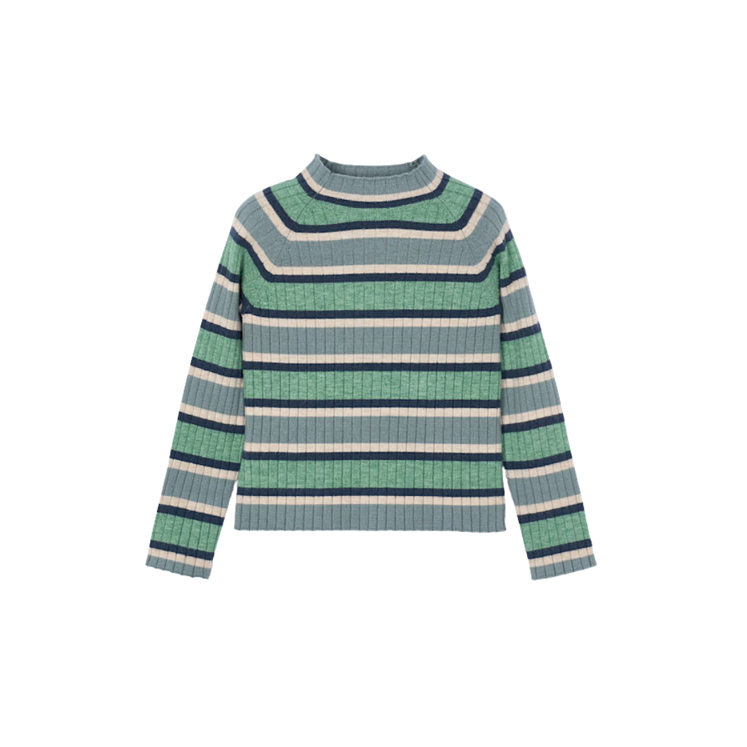 Playera de manga larga para niña. Cuello semi alto. Tejido de punto canalé. Elementos de adorno: detalles de ondas.