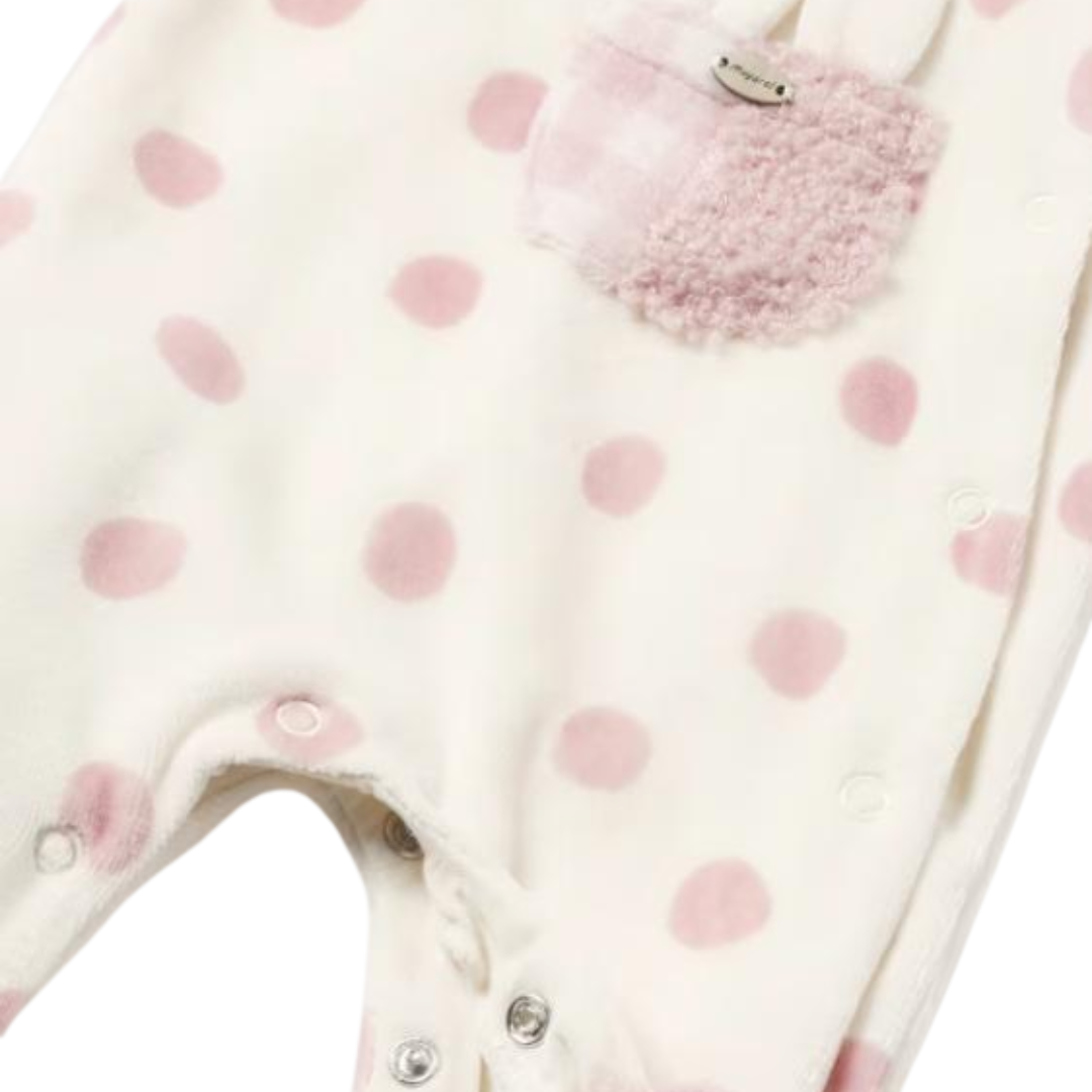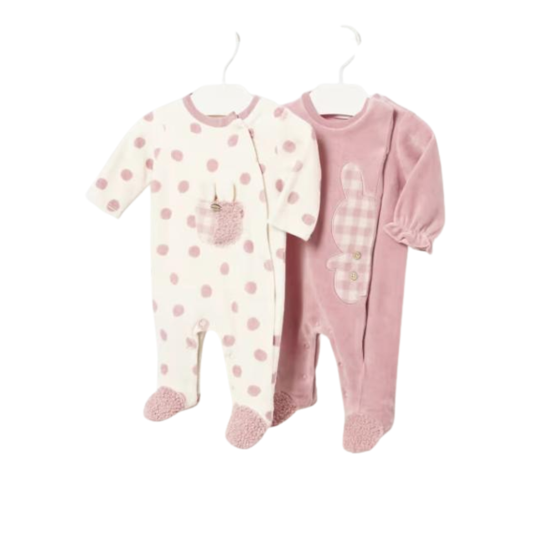 Set de dos pijamas tundosados para bebés , enterizos y de manga larga . Escote redondo , uno es color liso con el bordado de un conejo en vichy en el lateral y el otro estampado de lunares rosas sobre fondo crudo con conejito en el centro de la prenda . Detalle de rizo en la zona de los pies . Cierre con botones a presión en un lateral y en la entrepierna para hacer más práctico el cambio de pañal .