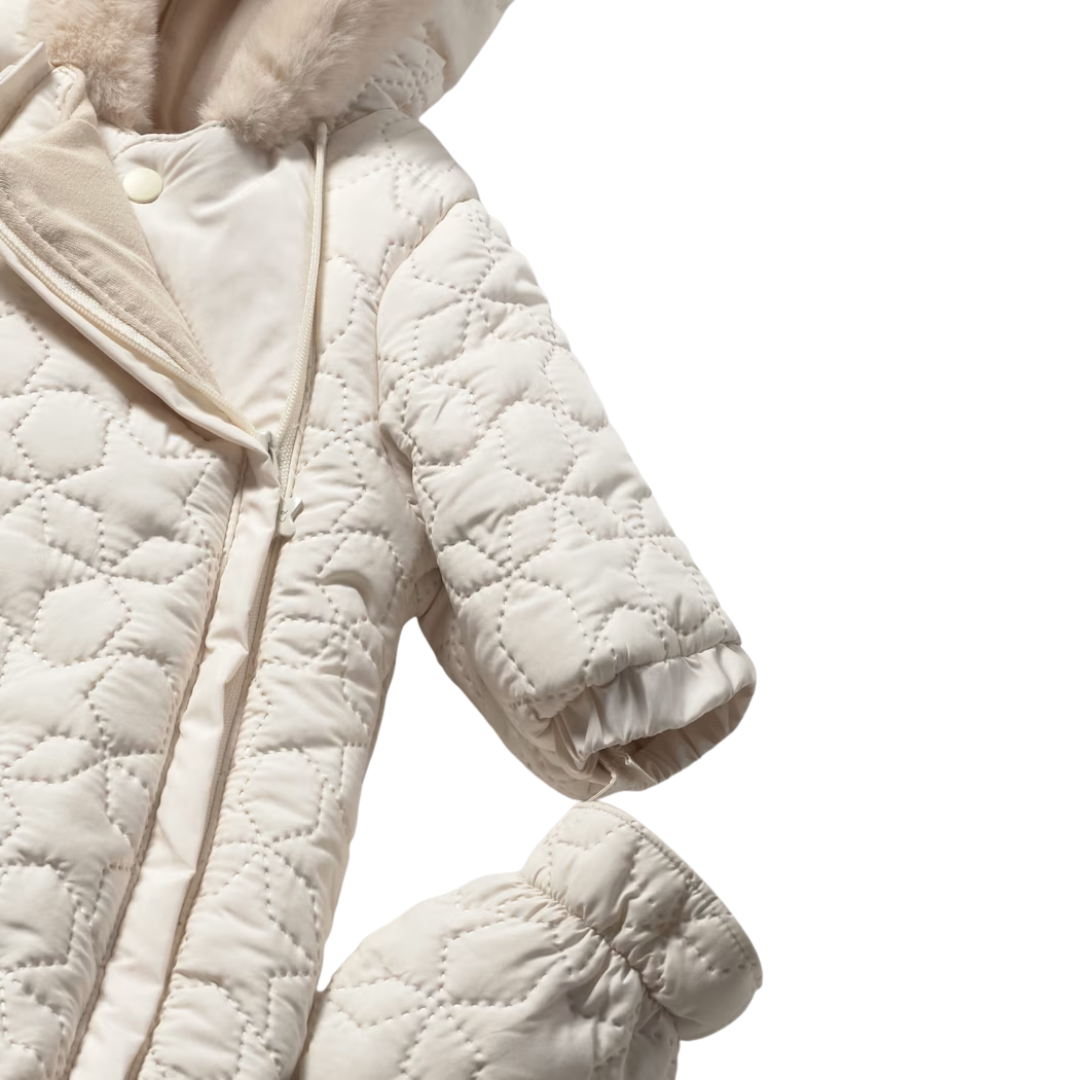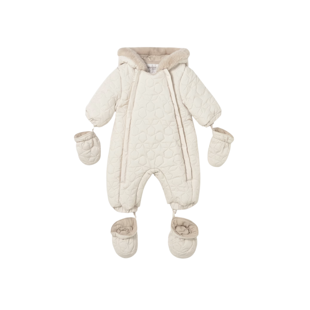Mameluco de manga larga para recién nacido. Capucha con detalles de pelo. Cierre central delantero con cremallera. Exterior textil con efecto acolchado.