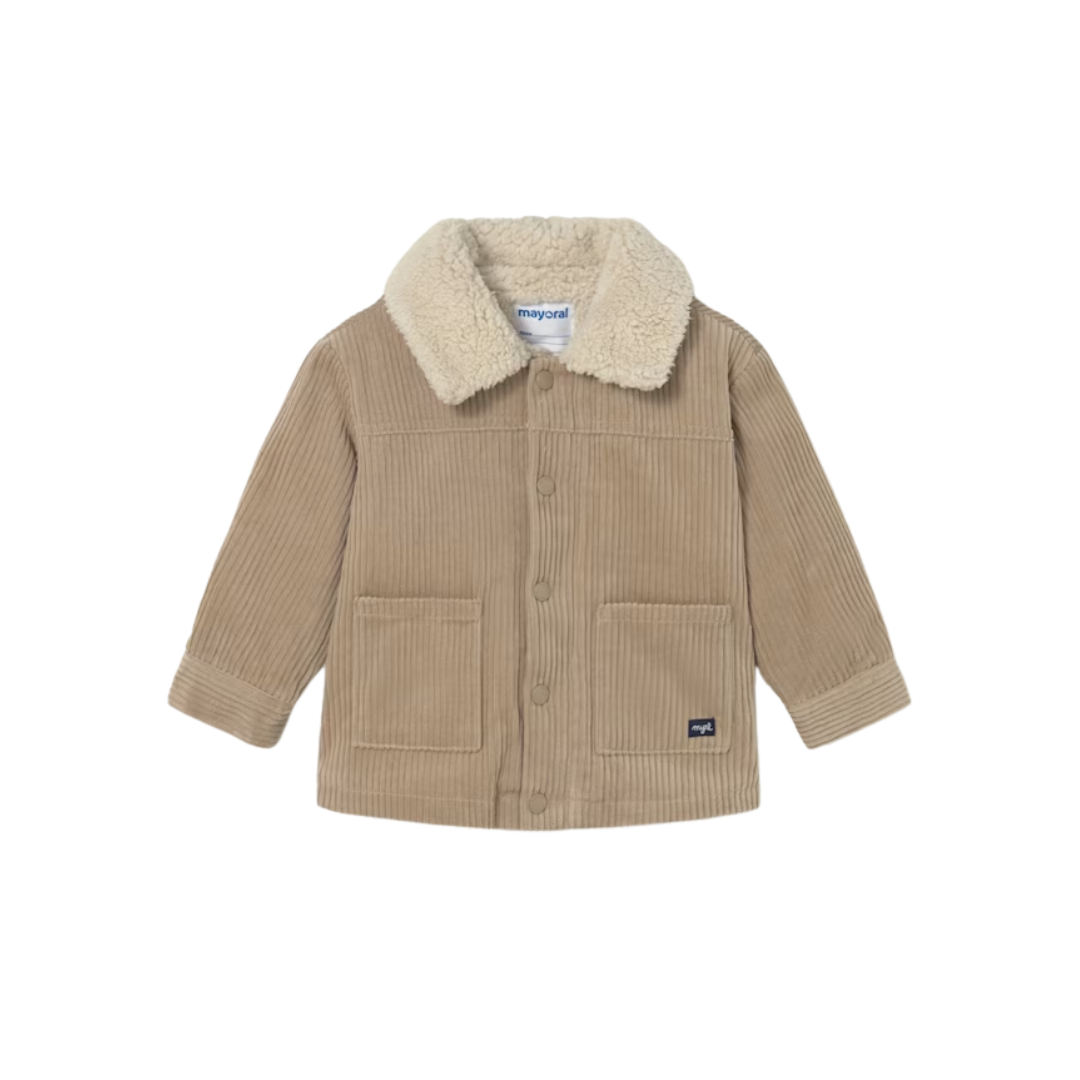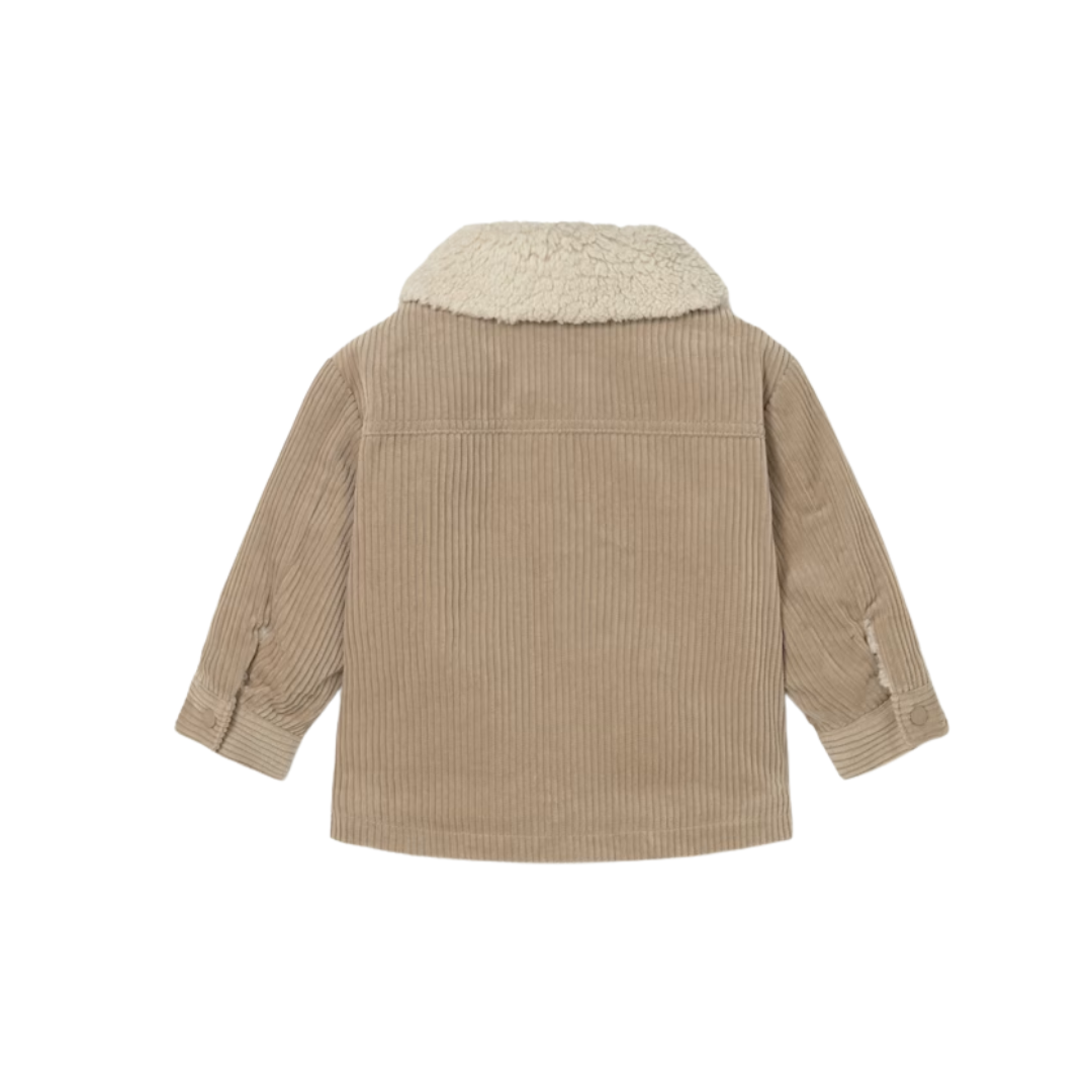 Abrigo de manga larga para bebé con puños abotonados. Cierre con botones a presión y cremallera en la parte delantera. Cálido tejido de pana de gran comodidad. Suave cuello y forro interior con borreguito sintético. Bolsillos delanteros. Se trata de un artículo de diseño unisex de gran versatilidad por la neutralidad de sus tonos y su forma.
