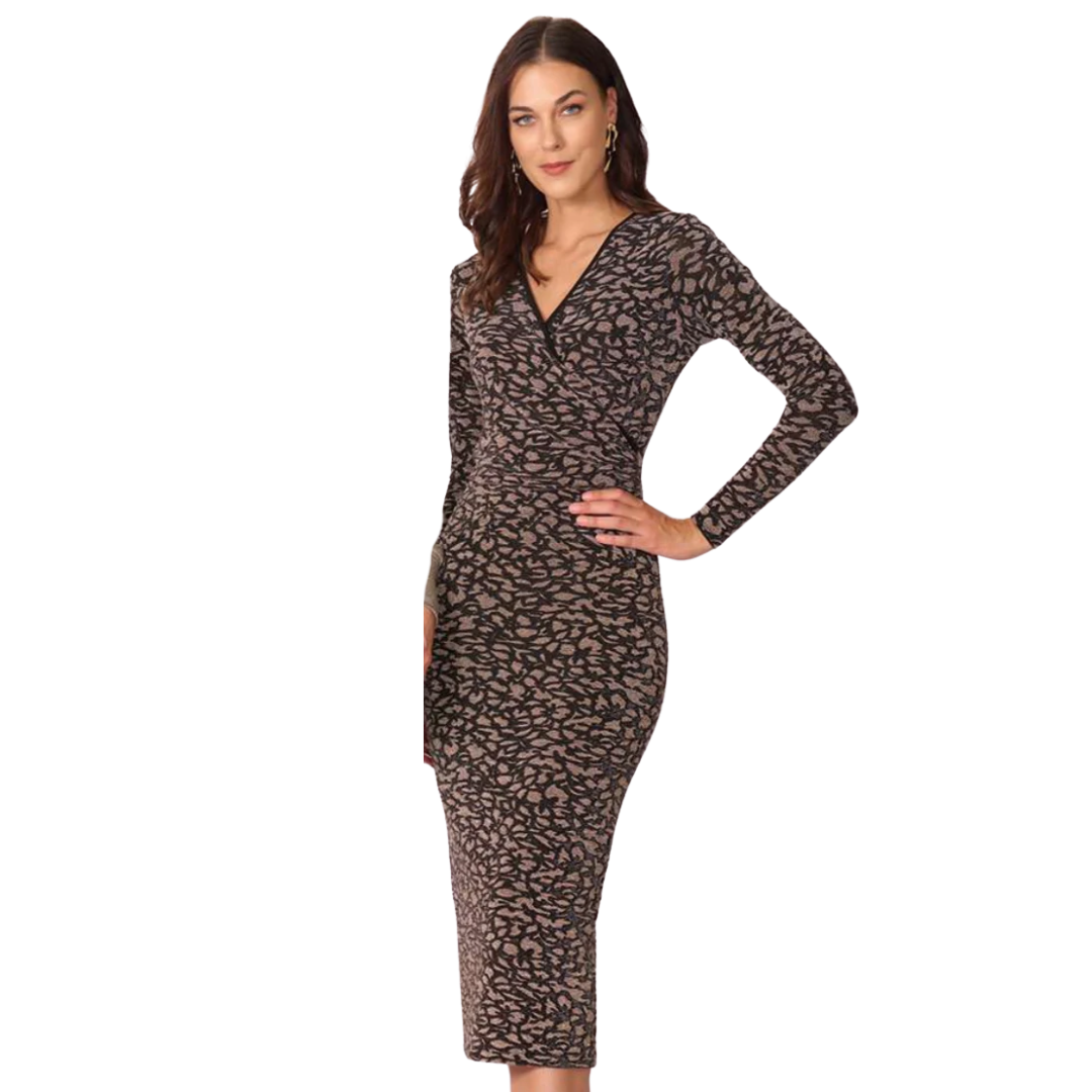 Elegante vestido midi, confeccionado en tejido negro con estampado metálico sutil que aporta brillo y sofisticación sin exagerar. Presenta manga larga, escote cruzado y corte que cae por debajo de la rodilla — ideal para una invitación, cena especial o uso diario con estilo. Disponible en tallas amplias para favorecer la figura.
