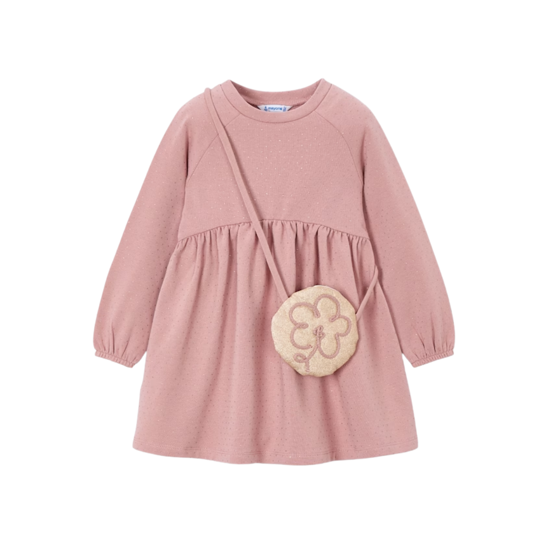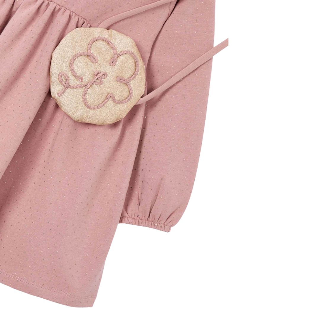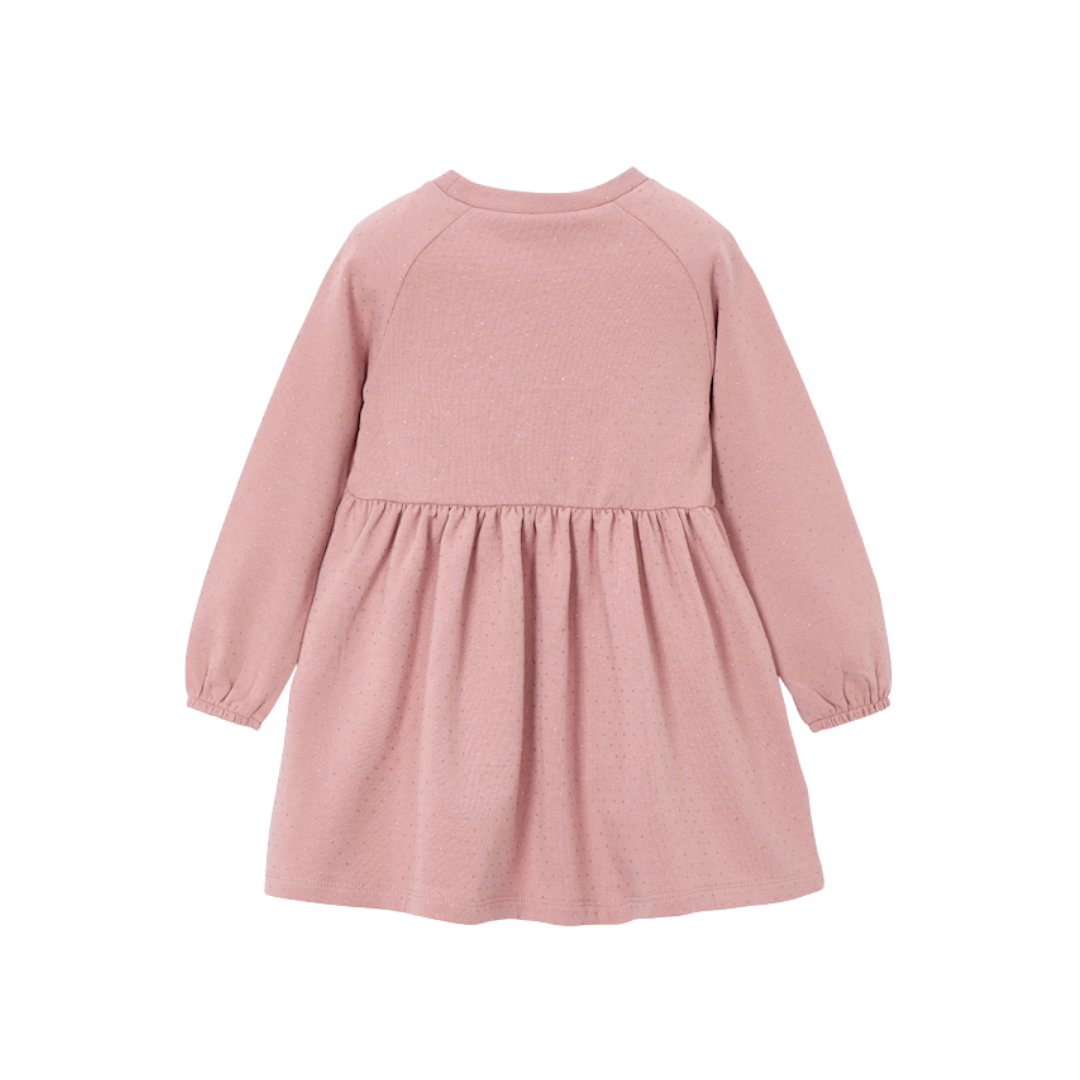 Vestido de manga ranglán para niña. Modelo con cuello barco. Cálido tejido de felpa gruesa (felpa perchada), perfecta para los meses fríos. Modelo con rizo.